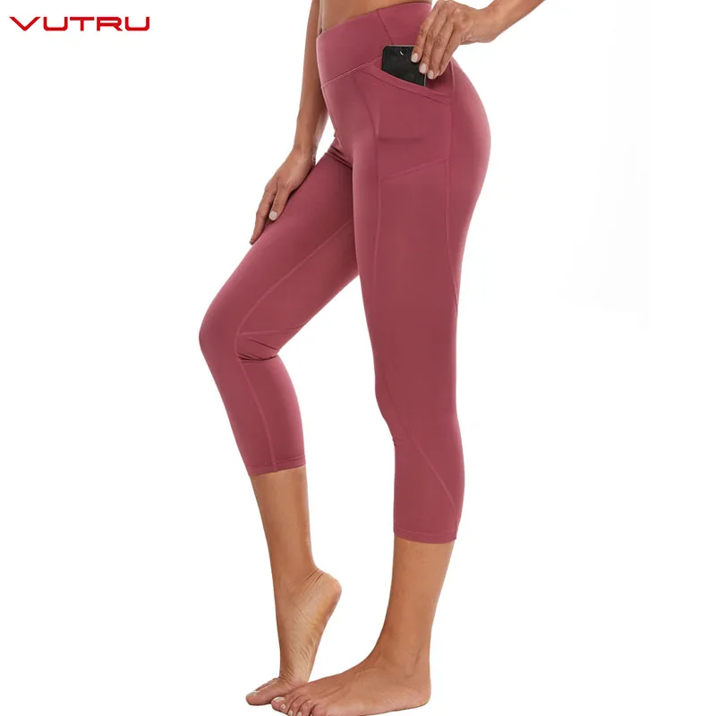 Vutru High Waist Fitness Women Seamless Yoga Pants Capri Sport Leggings with Pocket Stretchy Solid Workout Gym Tights Sport Wear