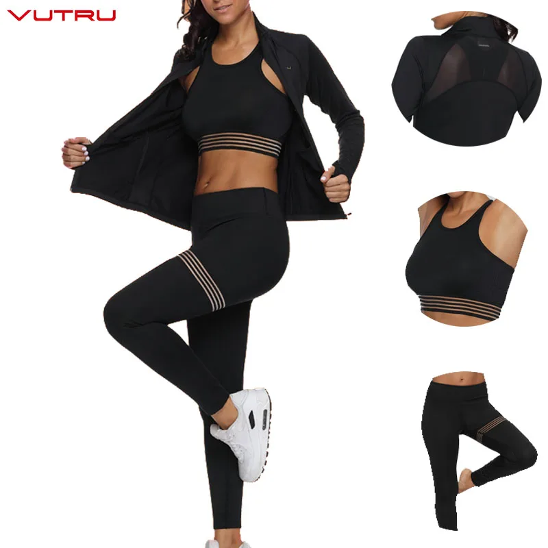 Vutru Women Yoga Set Long Sleeve 3 Pieces Sports Suits Mesh Backless Sexy Crop Top Bra+Seamless Legging+Sport Zipper Jacket Coat
