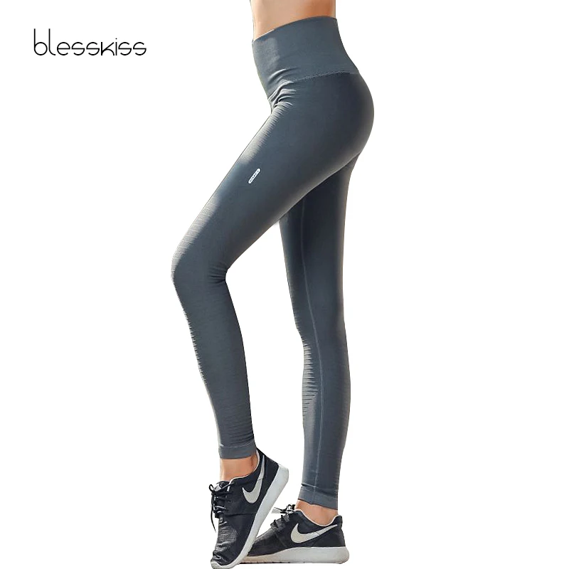 Good BLESSKISS High Waist Yoga Pants Sport Leggings For Fitness Women Running Cycling Elastic Lulu Tights Clothes Sport Trousers Blue For Sale at AliExpress