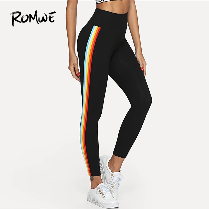 Good Romwe Sport Black Striped Side Waistband Skinny Women Yoga Pants Tights Stretchy Elastic Waist Outdoor Yoga Exercising Leggings For Sale at AliExpress
