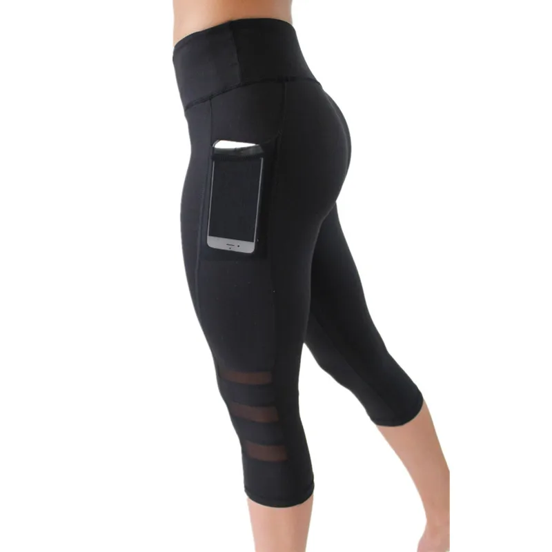 Women's Yoga Pants Leggings With Pockets Black Running Tights Calf-length Gym Mesh Patckwork Leggings Sport Fitness Dropship