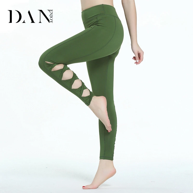 Best Price DANENJOY Hollow Bandage Yoga Pants Women Fitness Leggings Sport High Waist Ballet Dance Tight Cross Cropped Pants Sportswear For Sale at AliExpress